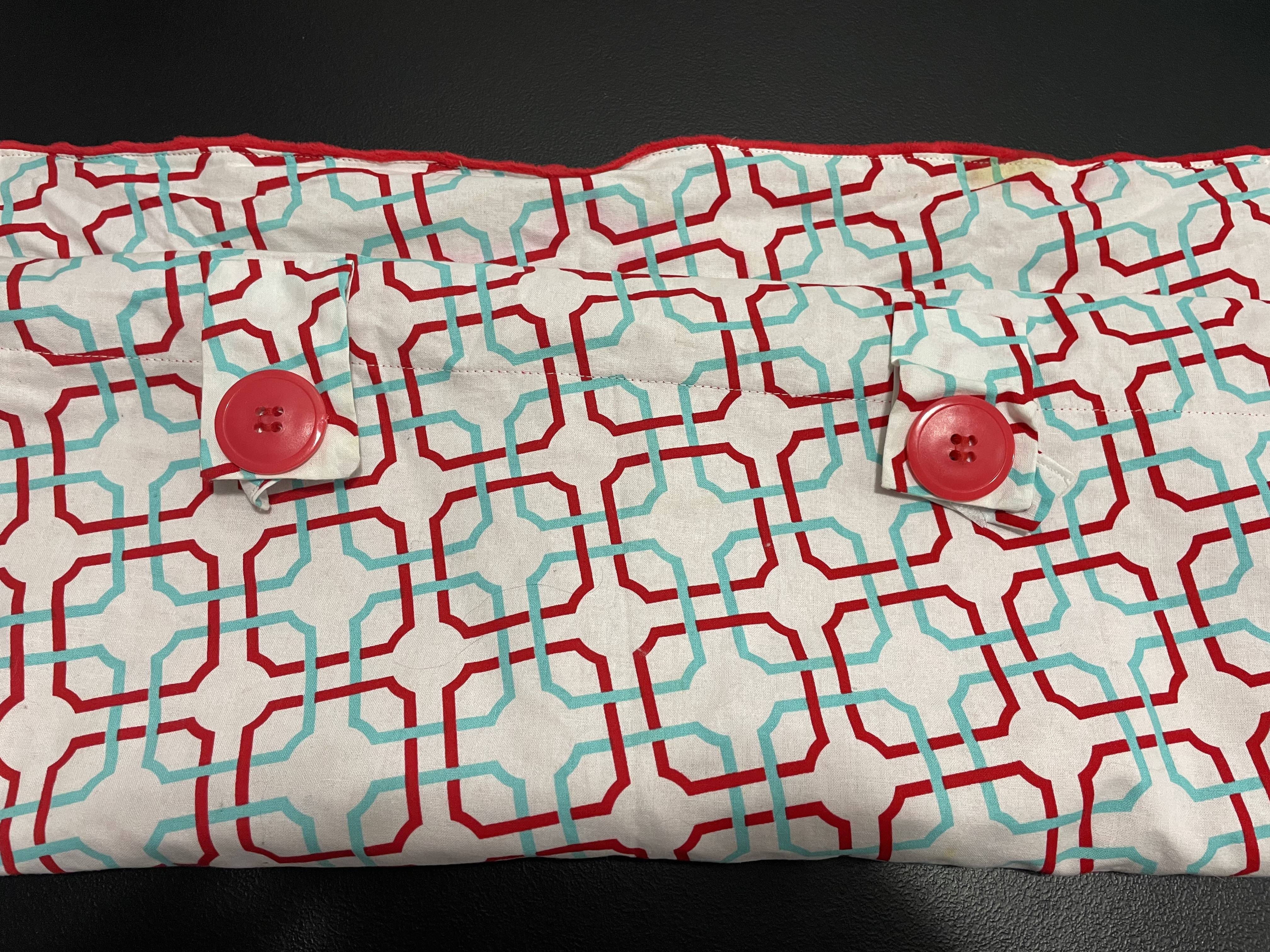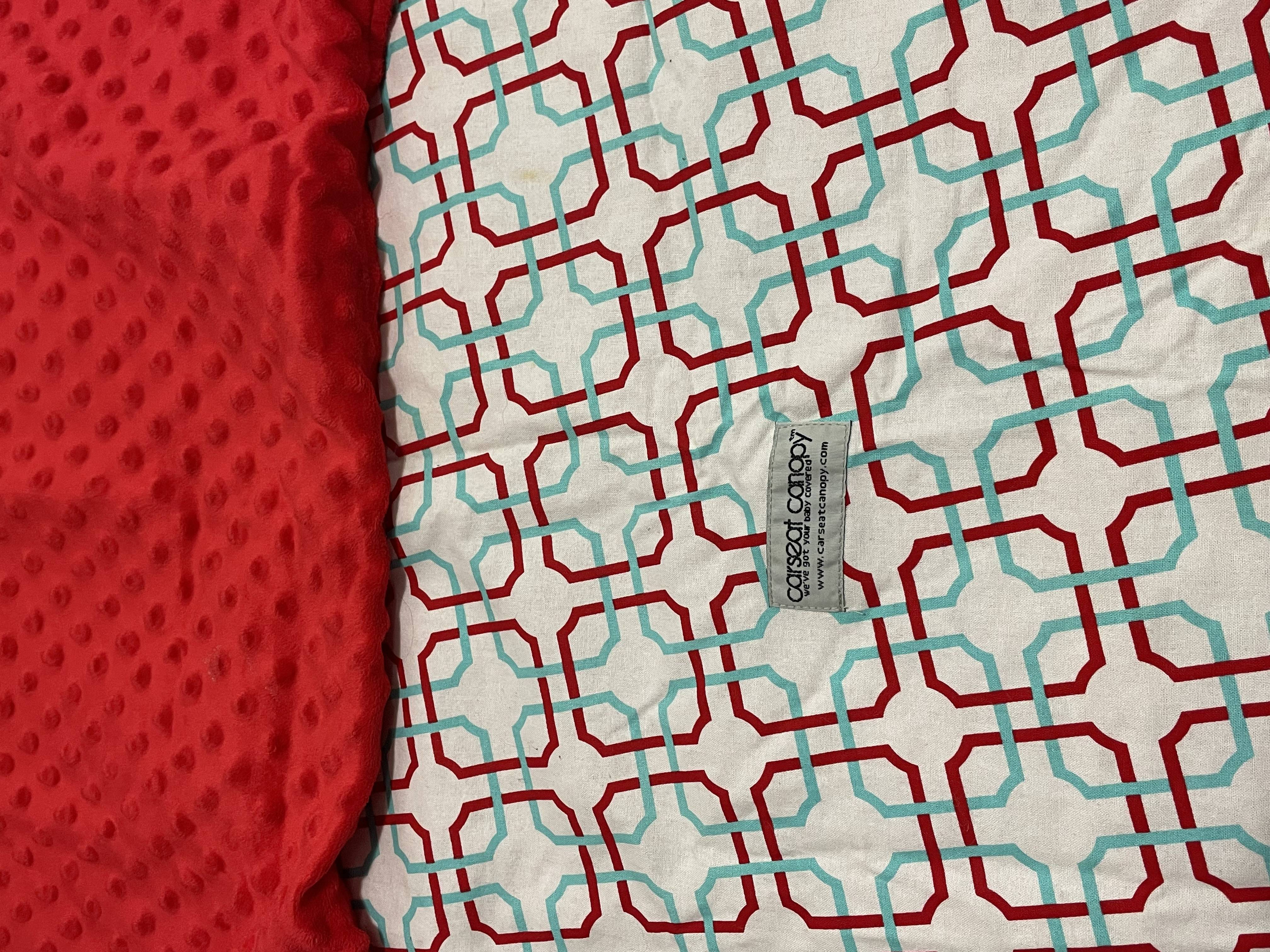 Carseat Company cover. Red/teal/white pattern. Reverse is solid red with fleece dots.